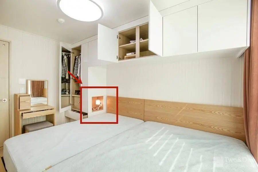 床头面积比较小,也可以考虑在侧面内嵌一个更简单的置物区,用来随手放手机、水杯等物品,顶部加入吊柜,用来收纳书本等杂物也很不错,提高了空间利用率。